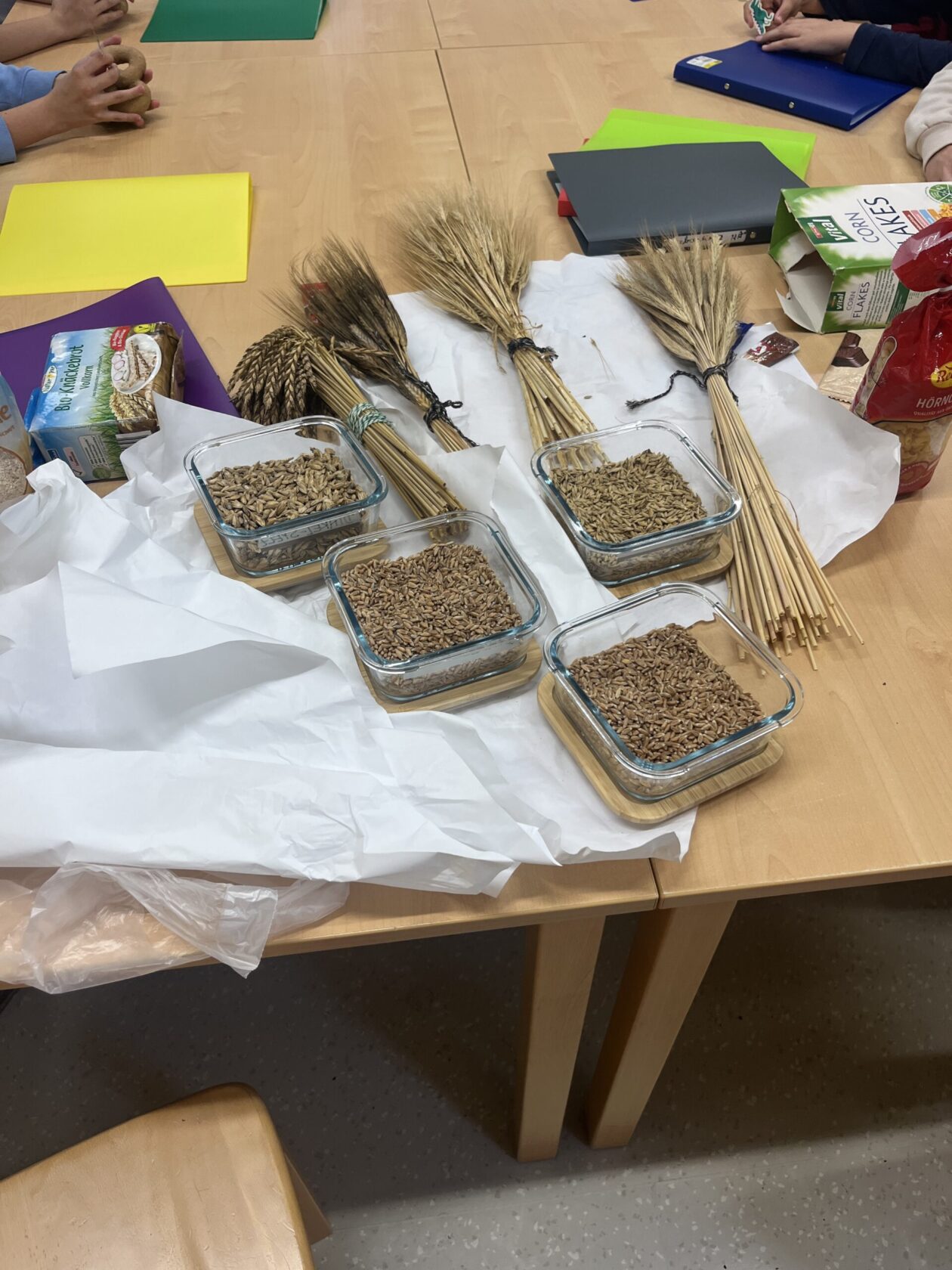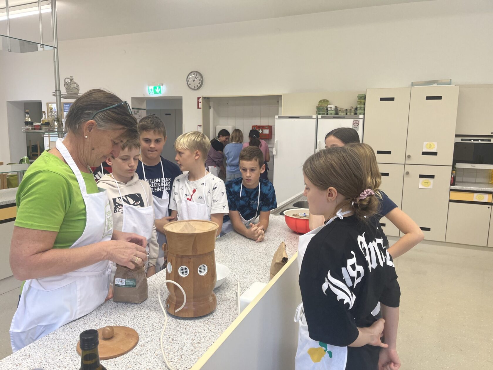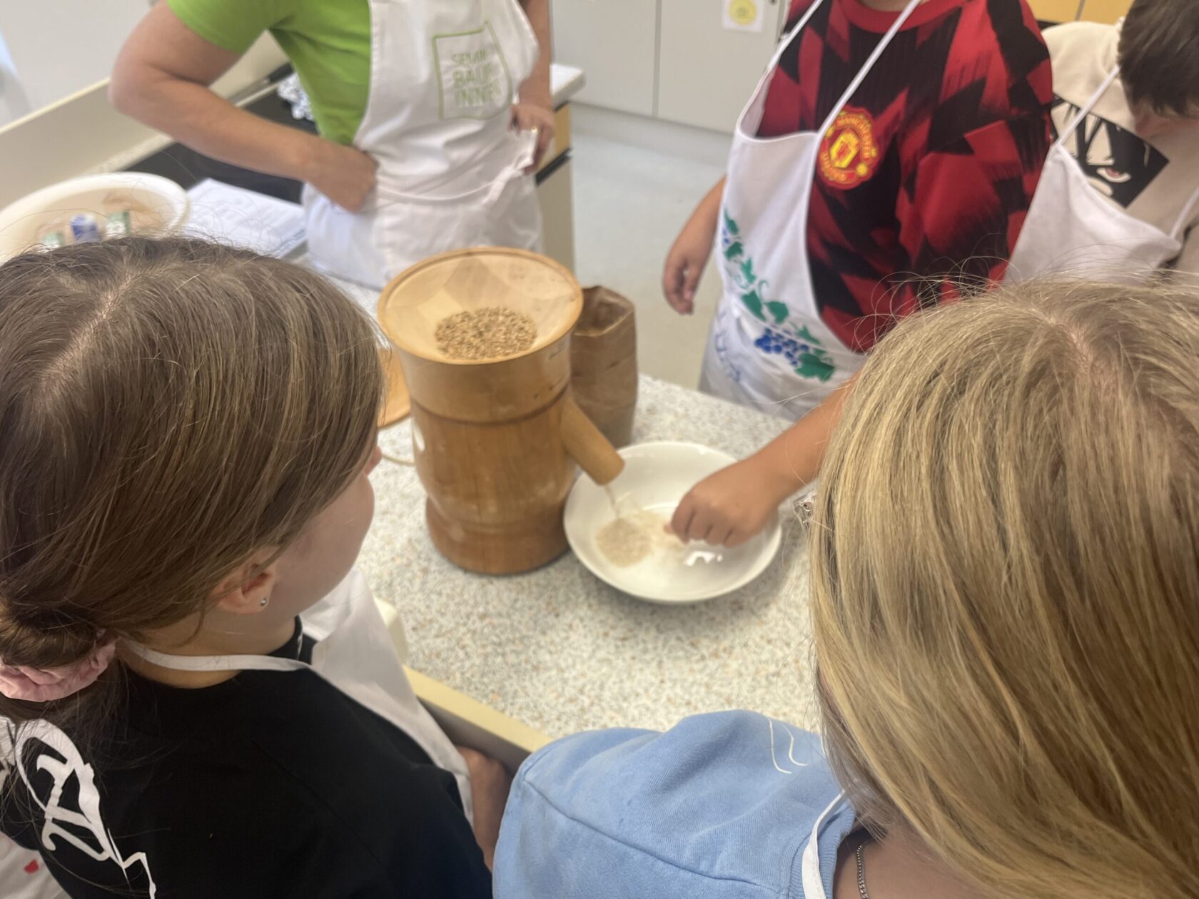 Zu Beginn erfuhren die Schüler:innen , welche Getreidesorten es gibt und wie diese verarbeitet werden. Mit großem Staunen betrachteten sie verschiedene Körner, mahlten selbst Mehl und konnten so jeden Schritt hautnah miterleben.